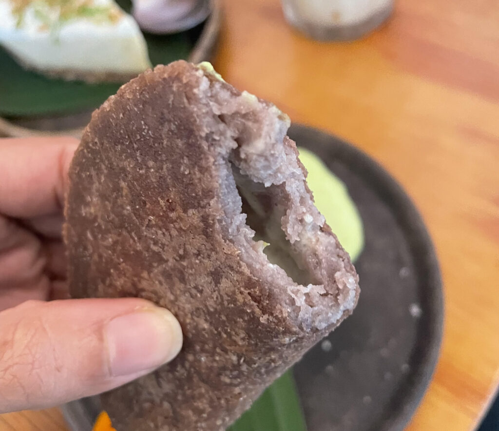 The empanada was a perfectly folded, fluffy black corn masa with warm, gooey cheese inside, and it came with a tangy green sauce to pair it with on the side. I loved this one!