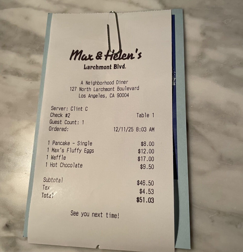 Unlike Palace Diner in Maine, the menu at Max and Helen’s is far more extensive and comes with a much steeper price tag: $14.50 malt shakes, a $27 patty melt, a $27 breakfast combo, and a wide range of salads starting at $16, with the green salad being the cheapest and the Chef’s Salad being the most expensive at $23. A smoked salmon platter with a bagel from LA’s cult following, Courage Bagels will run you $26.